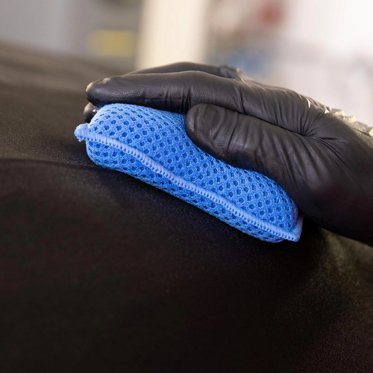 - Spray Soft Top Cleaner onto the fabric. Do not saturate. Agitate using the sponge provided. Allow the generated foam to penetrate before rinsing with a hose or a watering can.