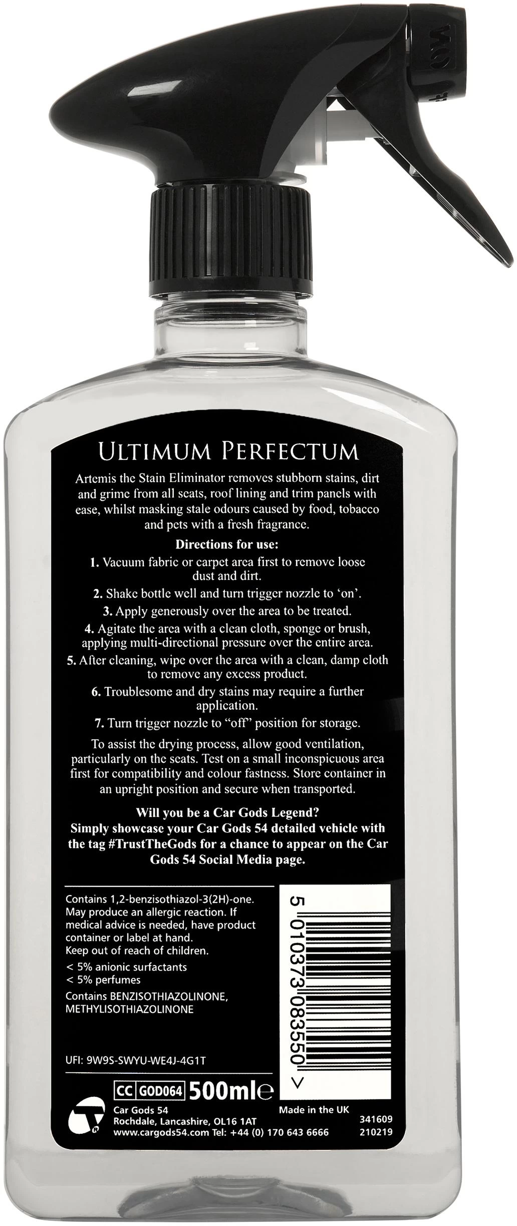 Car Gods 54 Artemis Stain Eliminator removes stubborn stains, dirt and grime from all seats, roof lining and trim panels with ease, whilst masking stale odours caused by food, tobacco and pets with a fresh fragrance.