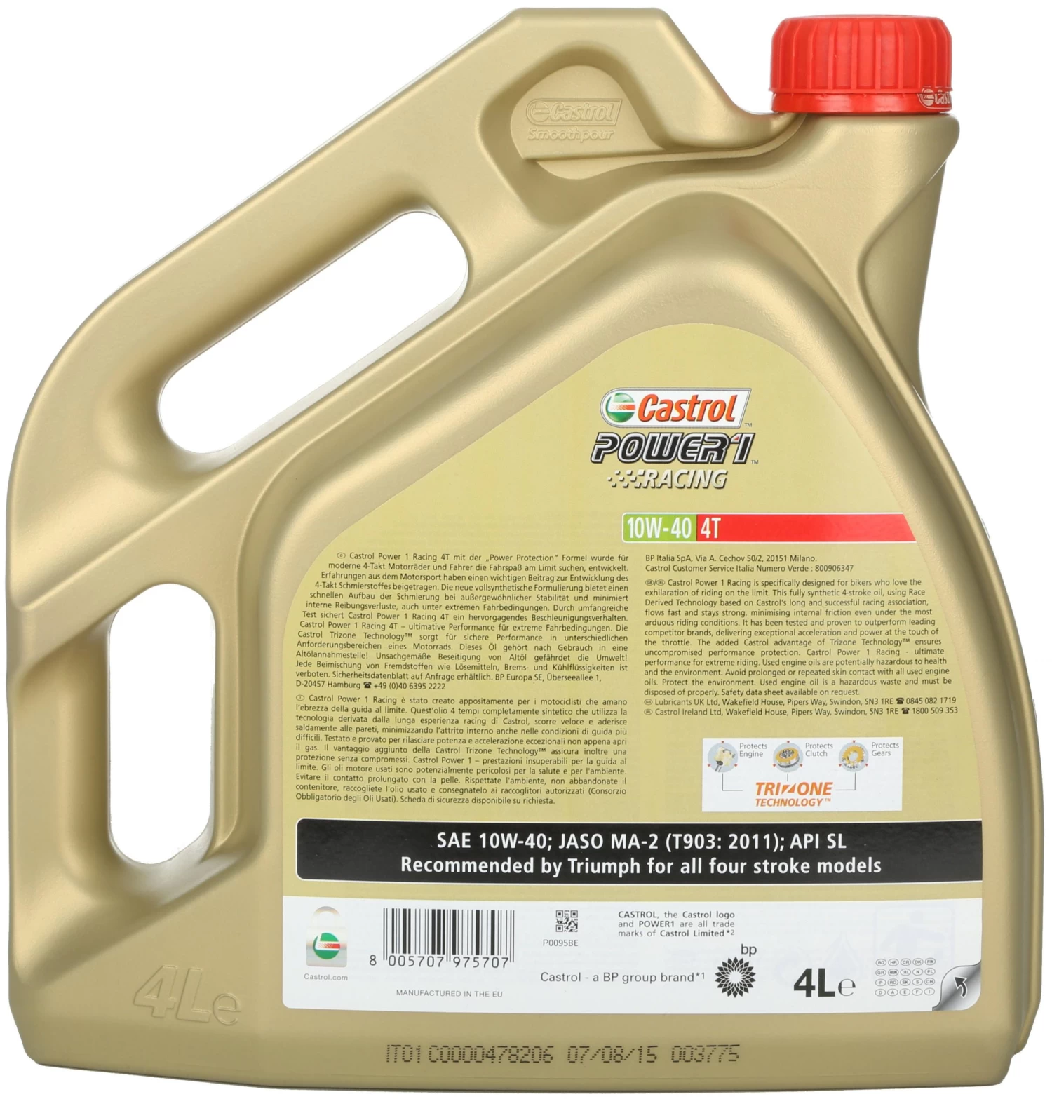 Feel the difference in your motorcycle's performance with the Castrol Power 1 Racing 4T 10W/40. It is a fully synthetic motorbike oil, which offers an unbeatable combination of enhanced acceleration and heightened protection for four-stoke motorcycle engines. It is designed for the latest motorbikes manufactured by the leading European and Japanese manufacturers.