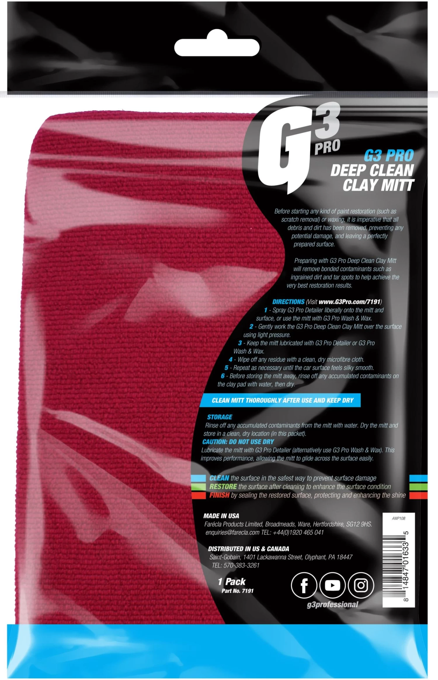 The Farecla G3 Pro Deep Clean Clay Mitt is an easy to use alternative to a traditional clay bar. This revolutionary mitt uses an advanced rubber polymer technology that easily removes ingrained dirt, bugs, tar spots and dulling pollutants from paintwork, windscreens and headlights.