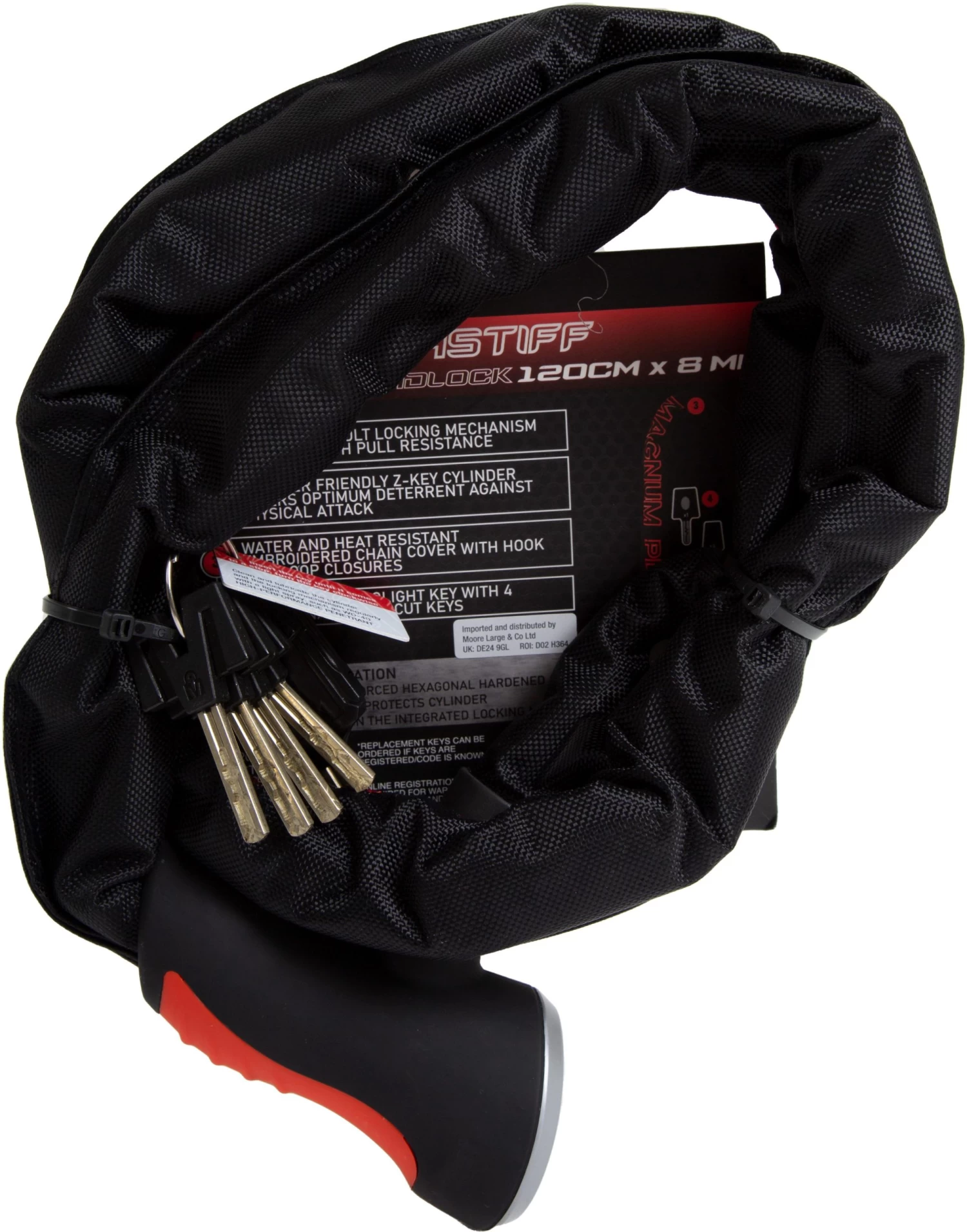 Magnum Plus Mastiff 150cm x 8mm motorcycle chain lock with reinforced titanium hardened square link chain mated to an integrated X2P dual lock down head featuring new double rubber cover for better protection against bumps and hits. The square links present more hardened surfaces than round links making sawing and cutting virtually impossible. Titanium surface hardening vastly increase cut and saw resistance. Embroidered nylon chain covers wont crack or peel along with hook and loop tabs keep the cover in place to help protect paint and finishes.