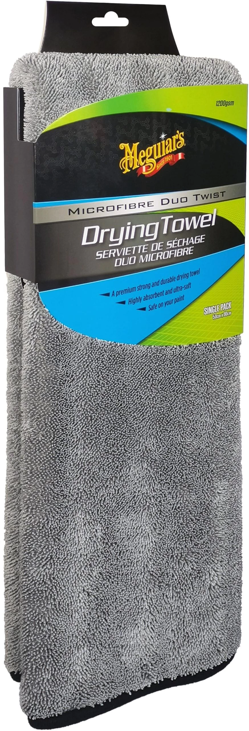 The Meguiar's Duo Twist Microfibre Drying Towel is our best performing drying towel yet. It is large (50cm x 90cm) and thick (1200gsm) with a duo twist microfibre weave making the towel impressively absorbent, making it quicker and easier to dry your car. Machine washable (just use detergent).
