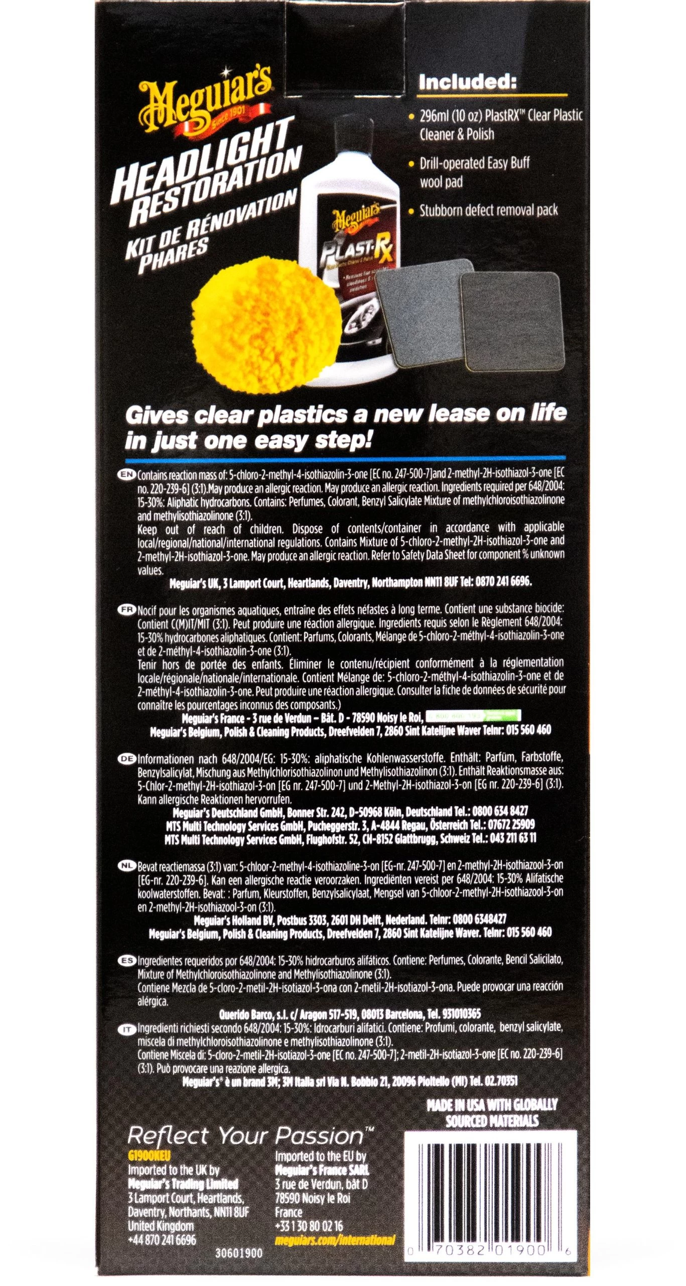 The Meguiar's Headlight and Clear Plastic Restoration Kit restores like-new clarity to cloudy, scratched, oxidized and yellowed, uncoated plastic surfaces. Meguiar's unique Plast-RX formula works in tandem with our unique buffing pad and your drill to safely deliver amazing results in just minutes! With this kit, you require no extra steps, complicated solutions or sanding with abrasives that can damage plastic and surrounding paint and trim.