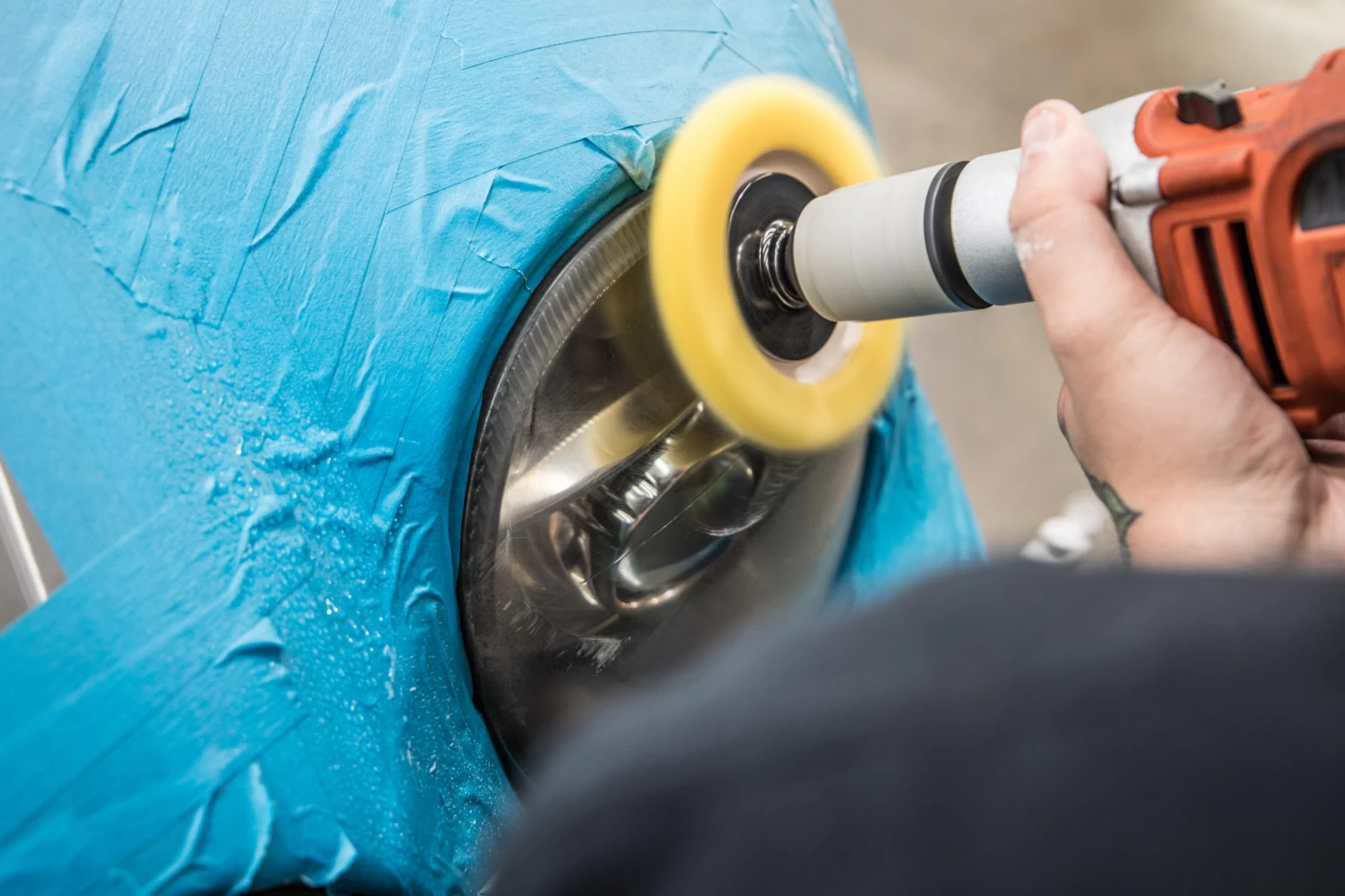- Apply a pound-sized amount of Plast-RX to the pad and place flatly on the surface to be restored. While spreading the product on the headlight, start the drill slowly to help prevent product sling. Once at full speed, keep the pad moving using slow overlapping passes in multiple directions. Reapply Plast-RX as needed