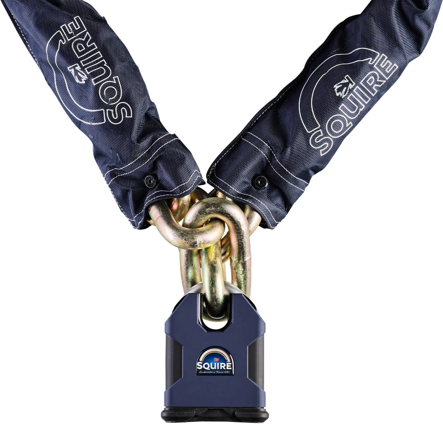 The Squire Behemoth lock combines a 22mm chain with the incredible SS100 CS lock, the package is rated to Sold Secure Diamond, while the padlock also has the Loss Prevention Certification Board (LPCB) SR4 level. Which sees it withstanding attack from a 12V cordless grinder, drills and hammers for ten minutes.
