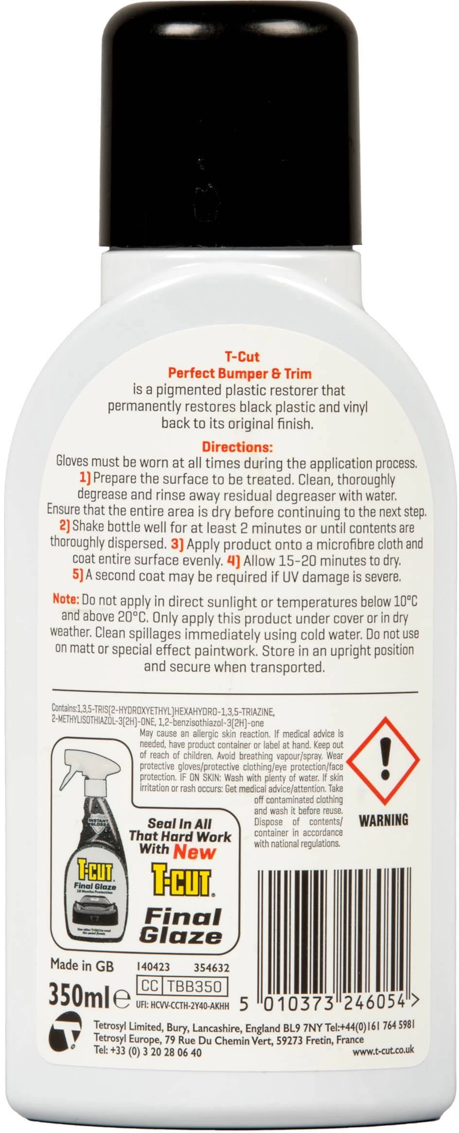 T-Cut Perfect Bumper & Trim is the number one solution for scuffed and sun-faded bumpers and trims. It is a pigmented permanent plastic restorer that permanently colours black plastic and vinyl back to its original finish. Ideal for unpainted bumpers, wheel wells, mouldings & door handles.
