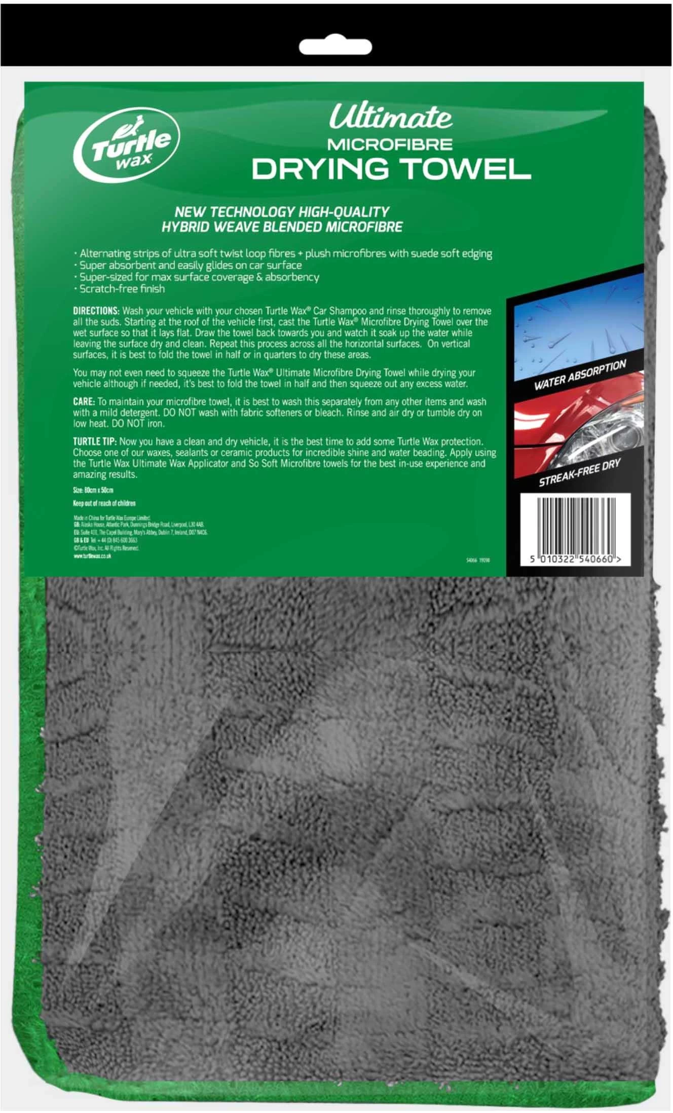 The Turtle Wax Ultimate Microfibre Drying Towel makes drying your car a breeze: it can hold up to 10 times its own weight in water to reduce time spent wringing out, and its super-size allows you to dry large areas quickly.
